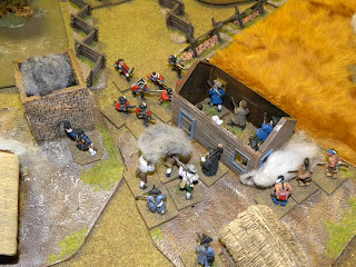 In third turn Jim reach the buildings and set fire on the first of them. My forces busy fighting with Derek's forces cannot stopped him by doing this. Donalds civilians fled from the burning house and tryed unlucky for them, fighting with French. After this French set the fire on the another building, but this time civilians escaped throw the back door. I had to detached some forces to defend the civilians and it stopped French actions in this area. In the Paul vs. Jack fight, Jack lost all his irregulars and militia. At this time we have to stopped the game, but the French victory was very clear, however at this stage was a draw. French to get the victory had to kill 2/3 of the civilians, and they not managed to do this, but I think that in next turn they will be able to do this very easly. During the game Biritish lost 36 figures vs. 22 of French (most of them ware Pauls Indians). It was another very enjoyable game with this set of rules.