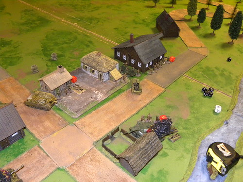 Po pierwsze, przygotowałem zbyt dużą grę jak na pierwszy raz dla co niektórych. Wyjaśnianie zasad nowicjuszom zabierało bardzo dużo czasu. Kilka innych osób w klubie jest również zainteresowana systemem, więc dla nich przygotuję znacznie mniejszą grę. Ze względu na rozmiar gry, udało nam sie dotrzeć do 8 rundy, kiedy sytuacja stała się naprawdę bardzo ciekawa. Wszystkie oddziały niemieckie były już na stole i zajmowały połowę wsi, gdy tymczasem sowieckie posiłki właśnie przybyły, lub miały przybyć w następnej turze (miałem zamiar puścić moje trzy T34/85 z tyłu Panthery i zaatakować ten czołg od tyłu). Uznaliśmy, że gra zakończyła się remisem, ponieważ jeszcze wszystko mogło się zdarzyć. Z całej gry jestem bardzo zadowolony i mam nadzieję, że reszta graczy również.