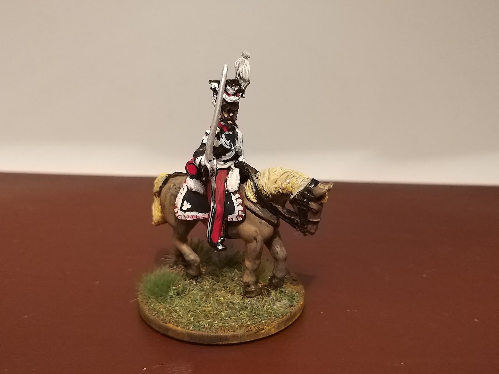 Kolejny oddział gotowy do mojej armii Księstwa Warszawskiego, jednak tym razem jest to kawaleria. Zaczynam od 1. Pułku Strzelców Konnych. Wszystkie figurki pochodzą od Front Rank a podstawki od Warbases. Razem z pułkiem pomalowałem dowódcę brygady kawalerii. Nie jest on dokładnie zgodny historycznie ponieważ była to moja zabawa z konwersją oficera ułanów, którego próbowałem przerobić na generała kawalerii. To moja pierwsza taka próba i być może w przyszłości wyjdzie ona lepiej. Drugim modelem jest figurka generała Jana Henryka Dąbrowskiego, mojego pierwszego generała dywizji. Co ze zgodnością historyczną modeli z tego zestawu. Niestety Wydawnictwo Karabela nie opublikowało jeszcze tomu poświęconego strzelcom konnym i musiałem tu bazować na obrazkach z mojej kolekcji. W stosunku do nich, tym razem Front Rank wykonał naprawdę dobrą robotę i ich strzelcy wyglądają naprawdę perfekcyjnie (prawdopodobnie więksi znawcy problematyki umundurowania epoki znaleźli by dużo błędów, ale dla mnie są ok.). Świetnie. Moim następnym oddziałem będą ułani z 2. pułku ułanów.