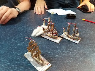 British started the game with a battle line formation, whereas Dutch in swarm formation. British line soon broke and Michael with his two ships (Anne and Yarmouth) separated from Peter's (Lion and fireship), who had some problems with catching the wind. Our ships moved against Michael's ships. My ships (Zeelandia and Elf Steden) moved against Yarmouth and Campbell's (Brederode and fireship) against Anne. After some initial firing Elf Steden caught Yarmouth and the boarding started. Soon Zeelandia and Brederode also joined the boarding and Yarmouth get captured. In the same time, Campbell with his fireship attacked Anne. British ship got hit by our fireship, but Michael managed to put the fire down. Now Anne seriously damaged move out the battlefield, but then Peter joined the fight. His fireship hit Brederode. Campbell was not that lucky like Michael with putting out the fire and his ship exploded. As my ships were very close Zeelandia and captured Yarmouth also captured fire. It looked like the Dutch crews forgot about their annual fire test because Zeelandia also exploded and Yarmouth burn to the waterline and sunk. The last Dutch ship decided to board Lion, but finally, got captured by the British crew. This time British victory!